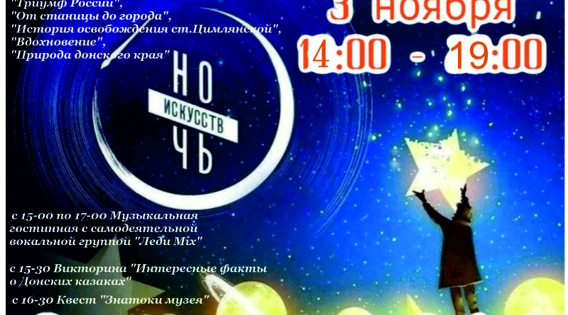 События «Ночи искусств» в МБУК «Цимлянский районный краеведческий музей» начнутся 3 ноября 2025 с 14-00 по 19-00.