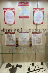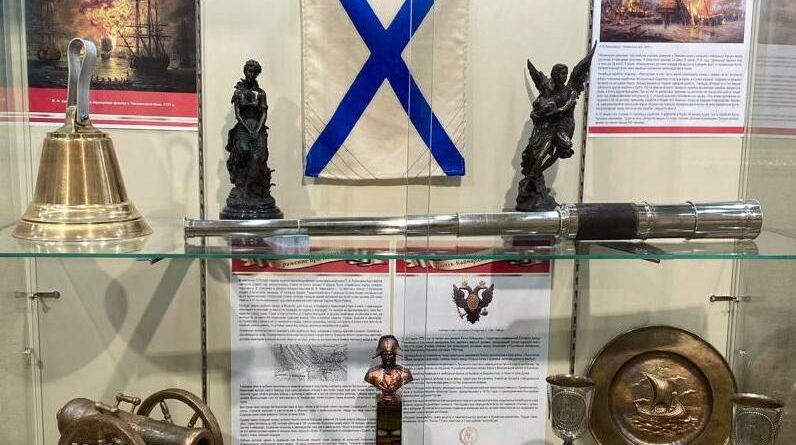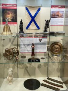 В музее представлены предметы из фондовых коллекций: снаряды, памятные медали, оловянные миниатюры сражений, Андреевский флаг, государственная символика.