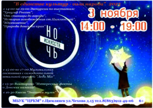 В этом году мероприятия будут приурочены ко Дню народного единства и пройдут под девизом «В единстве культур — сила народа». События «Ночи искусств» в МБУК «Цимлянский районный краеведческий музей» начнутся 3 ноября 2025 с 14-00 по 19-00. С 14-00 по 19-00 Экскурсии по выставкам: «Триумф России», «От станции до города», «История освобождения ст.Цимлянской», «Вдохновение», «Природа Донского края». С 15-00 по